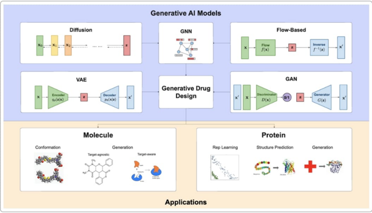 Figure 1. Generation AI model for molecular design. Latest approaches include (top column) diffusion model, graph neural networks (GNNs), normalized electrical models, variation car codes (VAEs), and generation controversial networks (GANs), chemical and latent structures, and (bottom row) applications new structures or (subformed) (Tang et al., 2024 [84†]).