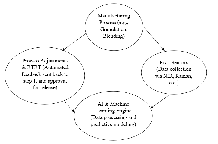 In recent years, the rapid advancement of AI and ML technologies has significantly improved the capabilities of PAT systems. AI algorithms can examine large volumes of process data generated by analytical sensors, identify complex patterns, and predict product quality in real time. Utilizing AI in conjunction with PAT enables pharmaceutical companies to enhance operational efficiency, optimize manufacturing processes, and decrease unpredictability. Consequently, AI-enabled PAT has become an important enabler for real-time release testing (RTRT) and continuous pharmaceutical manufacturing (7–9).