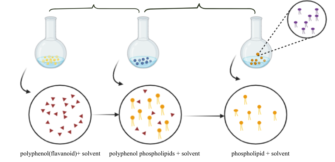 The complex can be separated by spraying, lyophilisation or precipitation mixed with non-solvents, including lithium-based hydrocarbons. During the complex formation of phytosomes, these two components form in a ratio of 0.5 to 2.0 moles. The ratio of flavonoids to phospholipids can be 1:1. shows how phytosomes are prepared methodically (5).