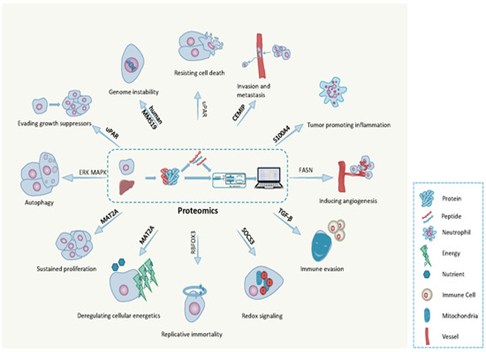 Methionine adenosyltransferase 2a (MAT2A). cell migration-inducing and hyaluronan-binding protein (CEMIP). fatty acid synthase (FASN). urokinase plasminogen activator receptor(uPAR). Proteomics helps improve the understanding of the Hallmarks of Cancer and plays a major role in uncovering the processes that lead to cancer growth. Methionine adenosyltransferase 2a (MAT2A) is a crucial enzyme involved in metabolism, and when it is missing, it stops cancer cells from growing quickly. This has been shown by Agios Pharmaceuticals in the US through the use of proteomics.[31,32]