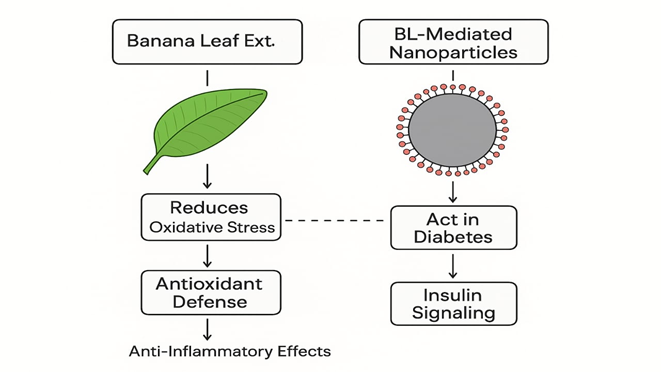 The banana leaf-mediated nanoparticles represent a rare intersection where traditional knowledge meets the edge-cutting nanotechnology, which is said to offer a sustainable and promising frontier in the management of diabetes. The phytochemical-rich coatings, versatile metal core and the eco-friendly synthesis of the nanoparticles enable the antioxidant, anti-inflammatory and the insulin-sensitising actions that mostly the conventional therapies fail to provide. However, this study from the laboratory to the clinics demands rigorous exploration, standardisation, manufacturing, safety studies, toxicology studies and the careful formulation approach. By involving strategic research, ethical oversight and innovation, the banana leaf nanoparticle has the potential to transform a common agricultural byproduct into an accessible antidiabetic therapy. This article has provided a thorough view of the effective use of the banana leaf nanoparticle in the anti-diabetic action. These mostly challenge the existing conventional therapies that are said to have more side effects. This traditional incorporated method can be used to give a futuristic direction to the herbal industry, which is mainly known for its lack of side effects and long-term therapy. This emerging field stands poised to reshape both nanomedicine and sustainable healthcare for the future.