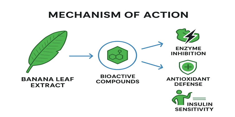 Diabetes mellitus, which is often considered a multifunctional metabolic disorder that is mainly characterised by chronic hyperglycaemia, has become one of the most common global health issues of the 21st century. Despite there is already the availability of synthetic hypoglycaemic agents and various insulin therapies, they have resulted in adverse effects, high cost and limited accessibility in the developing regions. This has led to an extensive use of plant-based therapy for the control of insulin levels. Among these various plants, the genus Musa or commonly referred to as the banana a plant that is extensively used for its medicinal values but also for its therapeutic versatility. Traditionally, various parts of the plant have been used for the treatment and management of the metabolic disorder commonly diabetes. This review mainly provides a comprehensive exploration of the banana leaf and its chemical components in the prevention and treatment of diabetes mellitus. Also, the mechanistic insights underlying the antidiabetic potential of banana, mainly the enhancement of insulin sensitivity, regulation of lipid metabolism, and modulation of glucose transport, have been reviewed. Furthermore, the role of antioxidants and polyphenols present in the banana leaf, which is a key component in restoring the pancreatic ?-cell integrity and maintaining glucose homeostasis. However, despite such promising data, human clinical trials and investigations remain sparse, and the optimisation, toxicity studies, and dosage potentials are still lacking. This review concludes by identifying the critical research gaps for future perspectives that mainly help bridge the gaps of traditional knowledge with pharmacology, urging the development of a banana leaf-derived nutraceutical and formulation as an affordable, eco-friendly and sustainable alternative for diabetic management.