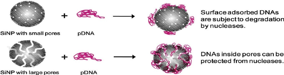Scheme 2. Monodispersed MSN (MMSN) can be tailored to have a large pore size (>15 nm) for increased plasmid DNA loading capacity and better protection from nucleases. Reprinted with permission from [32]. Copyright (2011) American Chemical Society.