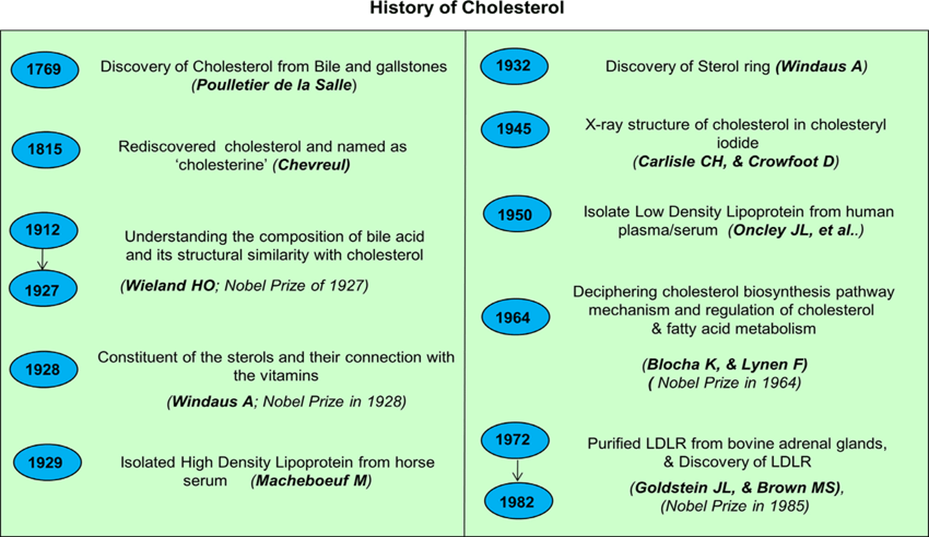 Fig. 2 Major breakthroughs of cholesterol-related discoveries in chronological order. Landmark discoveries in cholesterol biology (Mayengbam 2021)