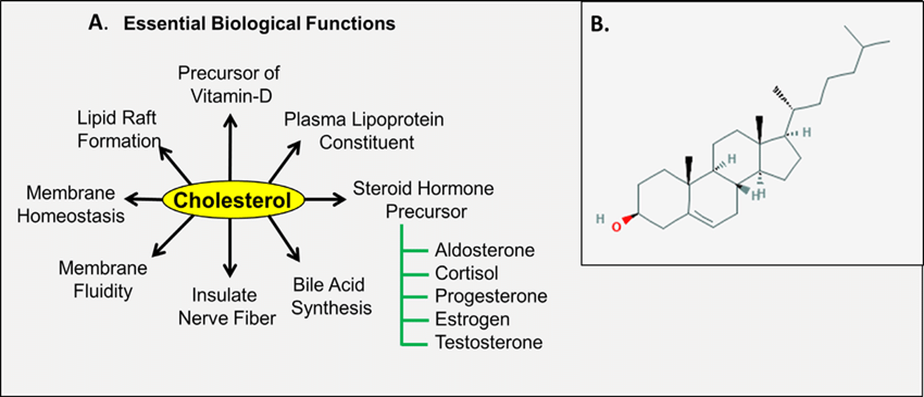 (A) Important biological functions of cholesterol. (B) Structure of cholesterol adopted from PubChem. Cholesterol is formed by 27 carbon atoms, 45 hydrogen atoms, and 1 hydroxyl group (C 27 H 46 O)
