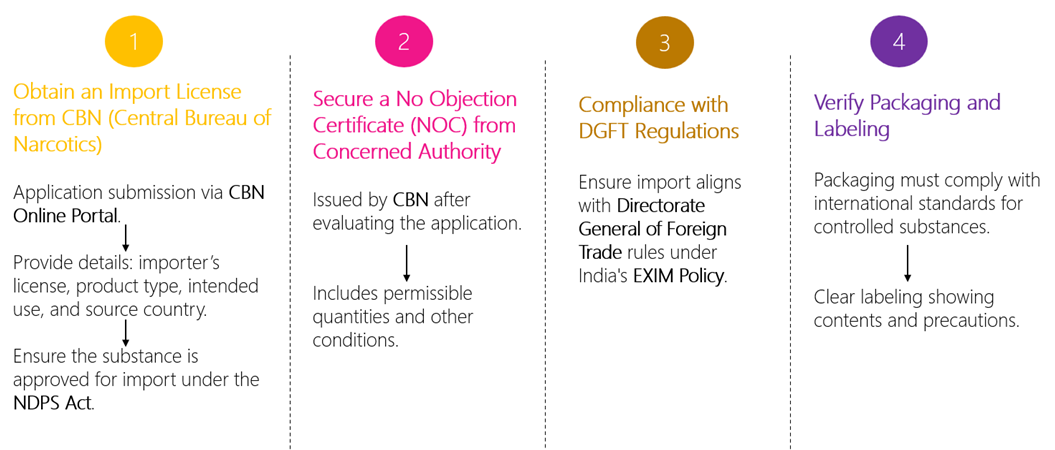 Importation of dual-use drugs is subject to prior approval, differentiating between their pharmaceutical production and non-medical uses. New drug clearances and licensing are assessed by the Drugs Technical Advisory Board (DTAB) and the Consultative Committee, ensuring compliance with regulations under the Central License Approving Authority. Manufacturers apply for a No Objection Certificate (NOC) for dual-use drugs by submitting the following documents: