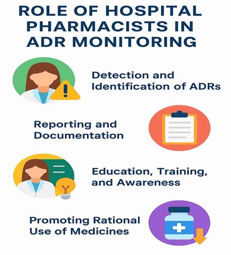Adverse drug reactions (ADRs) are an often overlooked but critical aspect of patient care in hospitals. In India, they pose a significant challenge, affecting patient safety, treatment outcomes, and overall healthcare resources. Hospital pharmacists are uniquely positioned to detect, monitor, and prevent ADRs, playing a crucial role in improving medication safety. This review explores how Indian hospitals are implementing ADR monitoring systems, particularly under the framework of the Pharmacovigilance Programme of India (PvPI). Studies from different parts of India highlight common trends: antimicrobials are frequently involved in ADRs, with dermatological and gastrointestinal reactions being most common. Yet, under-reporting remains a major hurdle due to lack of awareness, limited resources, and time constraints among healthcare staff. Hospital pharmacists can make a difference by leading ADR monitoring initiatives, collaborating closely with doctors and nurses, and utilizing tools such as the Naranjo algorithm and WHO-UMC causality assessment. Introducing structured protocols, regular staff training, and digital surveillance systems can further enhance detection and reporting. By combining vigilance with proactive engagement, Indian hospital pharmacies can not only reduce preventable ADRs but also contribute to safer and more effective patient care across the country.