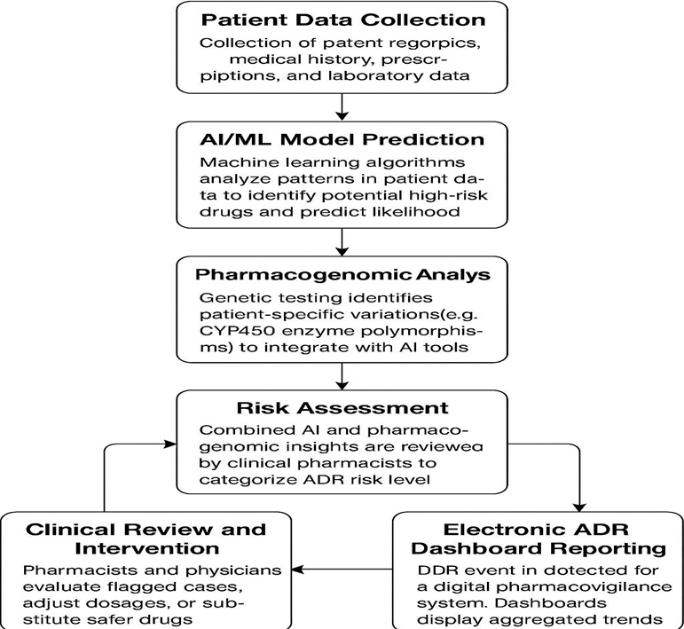 Artificial Intelligence (AI) and Machine Learning (ML) technologies are increasingly used to improve ADR prediction and management. These models can analyse large volumes of healthcare data such as electronic health records (EHRs), lab reports, and prescription data to identify high-risk patients. Algorithms such as neural networks, decision trees, and logistic regression can help predict ADRs associated with specific drugs by identifying complex patterns and risk factors. In Indian hospitals, AI and ML applications are still emerging but are expected to significantly transform pharmacovigilance by automating the detection of drug-safety signals. The introduction of AI-based tools into the Pharmacovigilance Programme of India (PvPI) has made digital reporting systems more efficient and accurate.