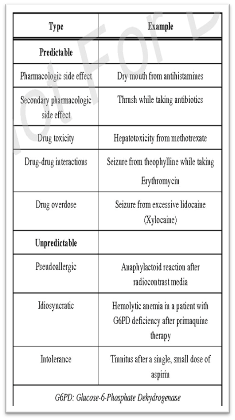 Type B (Bizarre): Unpredictable and dose independent. Often immune-mediated or due to genetics. Example: Anaphylaxis from penicillin, Stevens-Johnson syndrome from sulphonamides.
