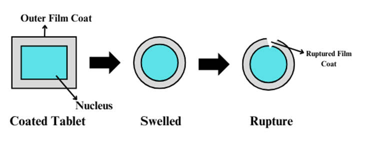 This device lacks the drug release orifice as well as the size is also smaller. When it comes in contact with aqueous media, water imbibe in and a pressure was created. The formed pressure breaks the device wall and active drug get released to surrounding (Fig. 9).