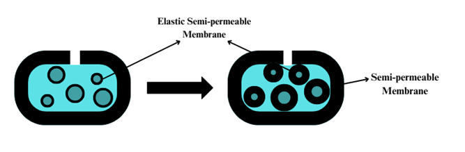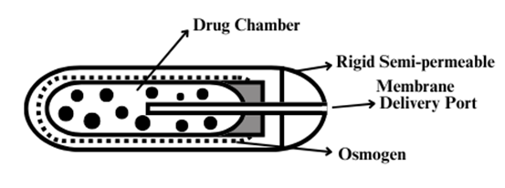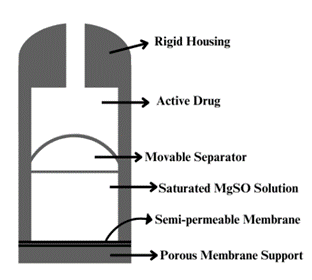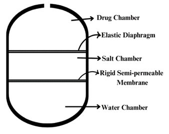 In 1955, the first osmotic pump was reported by two Australian Physiologist. They were working on the drug delivery to the gut of sheep and cattle. The pump was consists of three compartment one contained drug molecule with orifice, second had salt with elastic diaphragm which contains excess solid salt and third had water chamber (Fig.1). The semipermeable membrane were separates the dug and water compartments. The difference which was created by osmotic pressure, shifts the water to salt chamber. The volume of salt compartment gets increased due to this water flow, which further expands of latex diaphragm, results expulsion of drug from device.