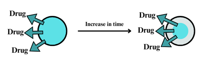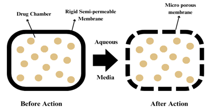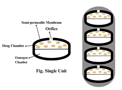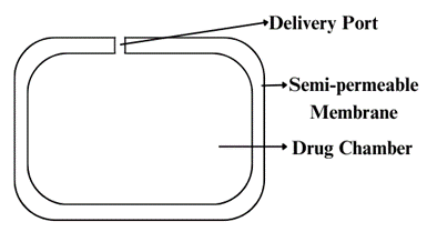 In 1974, Theeuwes invented the elementary osmotic pump and consists of active agent which has appropriate osmotic pressure. It is manufactured as tablet, core containing active drug with or without osmogen and coated with semi-permeable membrane. A tiny orifice is made in the membrane coating (Fig. 5). Exposure of tablet to aqueous environment results, tablet soaks the aqueous solution and forms saturated aqueous solution with the active drug inside the device. This formed saturated solution increases the volume in the device. The membrane is non-stretchable, increased volume leads to flow of saturated aqueous solution out of device through the orifice.