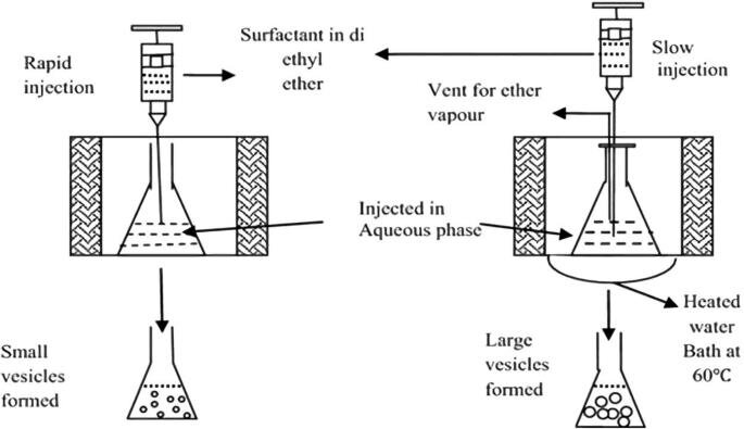A lipid solution in diethyl ether or an ether/methanol combination is gradually added to an aqueous solution containing the material intended for encapsulation at a temperature of 55-65°C or under reduced pressure. Removing the ether under vacuum afterwards results in the creation of liposomes. The key disadvantages of this method include a heterogeneous particle