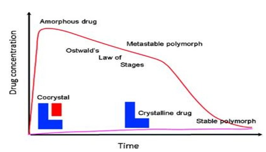 A theoretical process for deciphering supersaturated drug delivery systems the "spring and parachute" is a concept that is depicted in Pharmaceutics 2018, 10, 18, 12, 30. Similar to the drug's amorphous form, this abrupt occurrence may result in supra molecular aggregates or clusters of randomly orientated molecules lacking a high-level organization and periodic arrangement (spring effect) (6). The parachute effect, or maintenance of high solubility, can persist for a long period of time (120–300 min), because the transitions of these amorphous sums to stable crystalline phases and crystal development is expected to be a slow process that is prevented by polymers and excipients that are present in the stomach along with the drug. This high-energy amorphous phase is expected to fall into a meta-stable polymorphic form of the drug (of higher solubility), and eventually into a stable thermodynamic crystal form following Ostwald’s step rule, but until then, much of the drug will have been absorbed. The solubility of the co crystals has been reported in a variety of media (water, 0.1 N HCL, phosphate buffer, etc. Bio relevant dissolve media, such as simulated gastric fluids (SGF) or intestinal fluids (SIF), are also utilized in solubility tests. Particle size may have an impact on dissolution.
