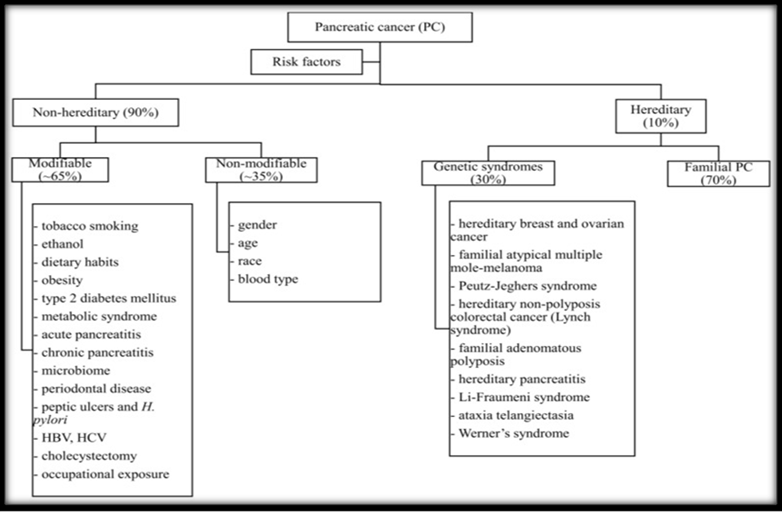 Risk factors that are not modifiable include gender, age, ethnicity, family history of pancreatic cancer, genetic factors, chronic infections, blood group.