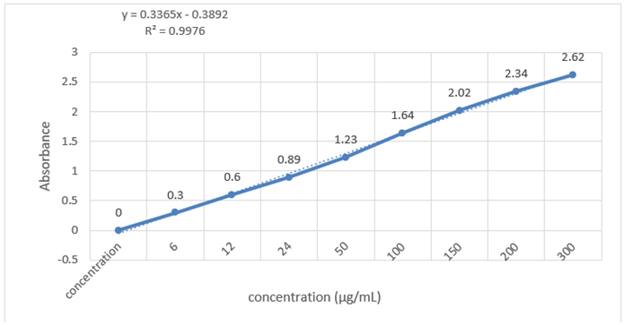 The linearity of Ampicillin Trihydrate was evaluated by preparing eight different concentrations ranging from 6 to 300 µg/mL from the standard stock solution. These solutions were analyzed at the previously determined λmax of 219 nm using a UV-visible spectrophotometer. The absorbance of each concentration was measured against a blank solution (diluent only). A calibration curve was constructed by plotting absorbance versus concentration, and the linearity was assessed by calculating the correlation coefficient (R²). The results demonstrated a direct and proportional relationship between absorbance and concentration within the studied range, indicating that the method is suitable for quantitative determination of Ampicillin Trihydrate in both pure form and capsule formulation.