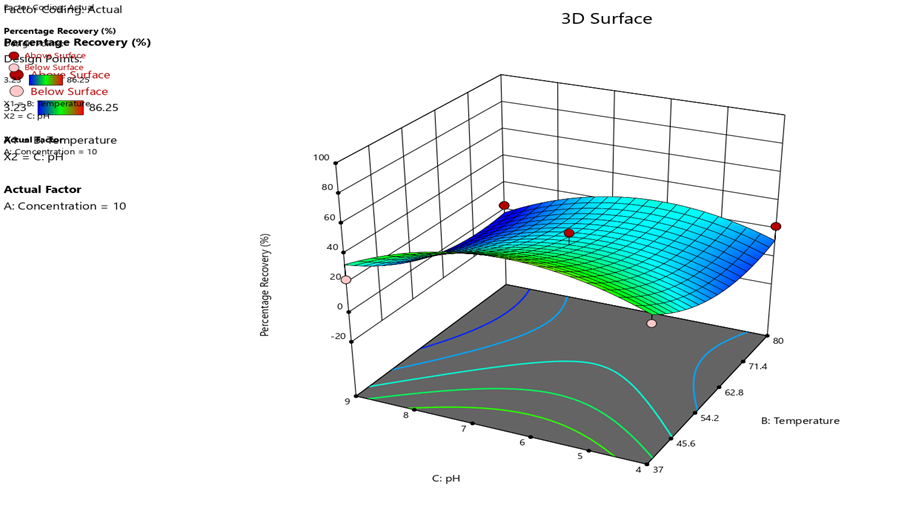 For conducting the study, we assume that the compound is stable at different condition and it is checked by measuring its percentage recovery28. Here we consider concentration, temperature and pH as independent variables and percentage recovery as dependent variables29. Several trial runs using all three possible combinations of these factors were performed30. The contour plot was created using data representing the relationship between the three parameters31. Box-Behnken design was constructed using the data obtained, and the significance of the method was checked using p-value and f-value obtained from the ANOVA table32.