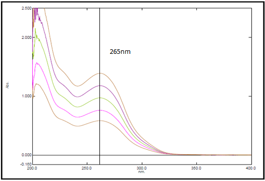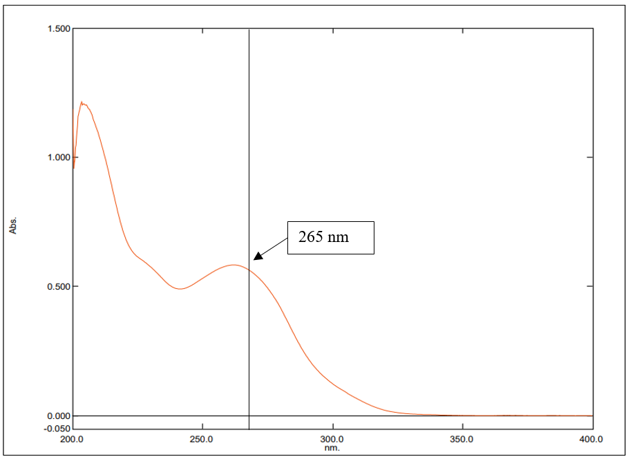 To determine the wavelength for measurement, Fimasartan Potassium trihydrate (10 µg/ml ) solutions were scanned between 400 – 200 nm. Absorbance maxima were obtained at their Wavelength max 265 nm for Fimasartan potassium trihydrate, respectively. There Wavelength was used for all measurement (Figure 3).