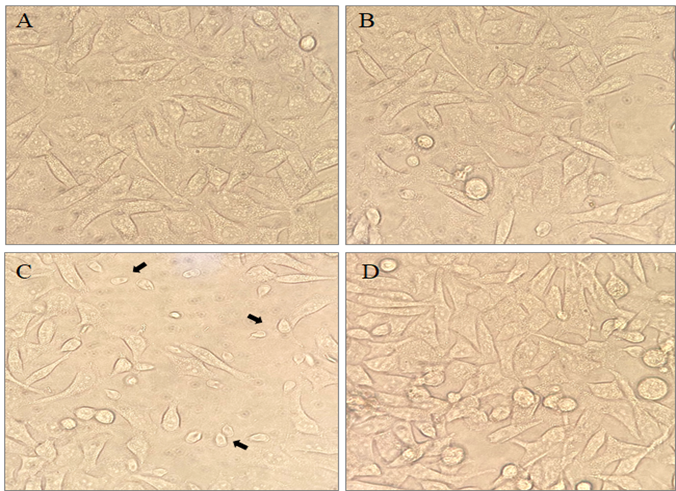 Figure 1: The effects of ADG on Co-culture: (A) Control INT-407 intestinal cells. (B) INT-407 cells treated with ADG. (C) Co-infection of Giardia with INT-407 cells, and (D) ADG treatment on co-infected cells.