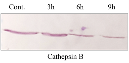 Recent studies have highlighted the significance of cathepsin B-like protease activities from Giardia in host-pathogen interactions (Beatty et al. 2017; Manko et al. 2017). However, the specific proteases involved have not been identified. Our study focuses on the expression of cathepsin-B genes, which belong to the Cysteine protease family, to identify proteomic-level expression changes following ADG treatment. Over different time intervals (3h, 6h and 9h), there was a gradual decrease in expression of cathepsin B.