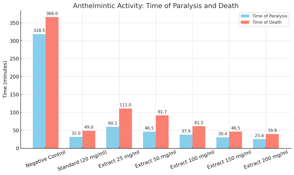 Despite the fact that all of the extracts had anthelmintic properties, the current study indicated that the methanol extract was more effective than the others. The various extracts' concentrations affected the activity. It was discovered that the extracts' activity was inversely correlated with how long it took for the earthworms to paralyze or die.