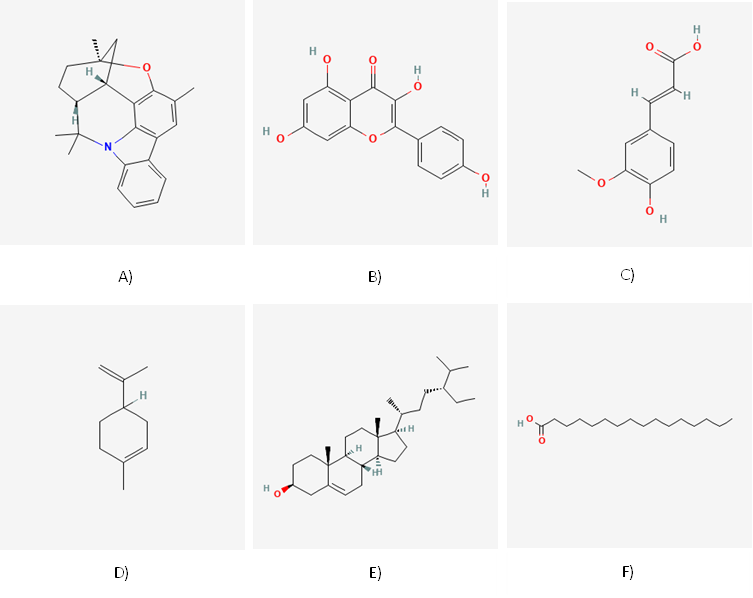 Figure 2: Representative Scaffolds of Major Natural Product Classes: (A) Hapalindole A, (B) Kaempferol, (C) Ferulic acid, (D) Limonene, (E) β-Sitosterol, and (F) Stearic acid.
