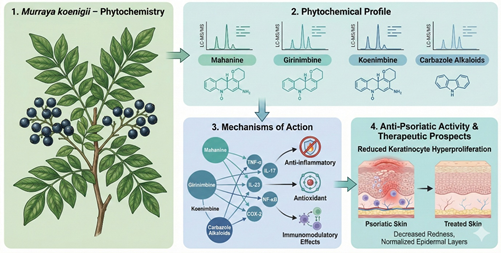 Psoriasis is a chronic, immune-mediated inflammatory skin disorder characterized by erythematous, scaly plaques, keratinocyte hyperproliferation, and immune dysregulation. It affects approximately 2–3% of the global population, with significant regional variation, and is associated with both physical discomfort and psychosocial burden. Psoriatic lesions are commonly observed on the scalp, elbows, knees, and lower back, though generalized forms can occur.[1] Beyond the skin, psoriasis is linked to systemic comorbidities, including psoriatic arthritis, cardiovascular disease, metabolic syndrome, and depression, highlighting the need for effective and comprehensive therapeutic approaches. The pathophysiology of psoriasis is complex, involving a multifaceted interplay of genetic, immunological, and environmental factors. Genetic predisposition includes polymorphisms in genes associated with skin barrier function, immune signaling, and keratinocyte differentiation.[2] Dysregulation of the innate and adaptive immune system, particularly activation of dendritic cells and T helper (Th) cells such as Th1, Th17, and Th22, leads to overproduction of pro-inflammatory cytokines, including TNF-α, IL-17, IL-22, and IL-23. These cytokines drive keratinocyte proliferation, angiogenesis, and chronic inflammation, establishing a self-perpetuating cycle of disease. Oxidative stress further exacerbates inflammation by promoting the generation of reactive oxygen species (ROS), which activate inflammatory pathways and contribute to tissue damage. Current therapeutic strategies for psoriasis include topical agents (corticosteroids, vitamin D analogs, and retinoids), systemic drugs (methotrexate, cyclosporine, and acitretin), and biologic therapies targeting specific cytokines or immune pathways (anti-TNF, anti-IL-17, and anti-IL-23 monoclonal antibodies).[3] Although these treatments can provide symptomatic relief and disease control, they are often associated with limitations such as adverse effects, high cost, partial response, and risk of relapse upon discontinuation. These challenges have driven the search for safer, multi-target, and cost-effective alternatives, particularly from natural products with a long history of medicinal use. Herbal medicines offer a promising approach due to their ability to target multiple pathogenic pathways simultaneously. Among these, Murraya koenigii (L.) Spreng., commonly known as curry leaf, has attracted attention for its diverse pharmacological properties.[4] Widely used in South Asian cuisine and traditional medicine, Murraya koenigii contains bioactive phytochemicals such as carbazole alkaloids, flavonoids, phenolics, and terpenoids. These compounds exhibit anti-inflammatory, antioxidant, immunomodulatory, anti-proliferative, antimicrobial, and wound-healing activities mechanisms directly relevant to the pathogenesis of psoriasis. The ethnomedicinal use of Murraya koenigii in Ayurveda, Siddha, and folk medicine for skin ailments, inflammation, and wound healing provides a historical basis for its therapeutic potential. Leaf pastes, decoctions, and infused oils have traditionally been used to treat rashes, ulcers, itching, and chronic lesions, reflecting empirical knowledge of its anti-inflammatory and healing properties. This intersection of traditional use and modern pharmacology positions Murraya koenigii as a compelling candidate for further investigation in psoriasis management.[5]