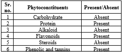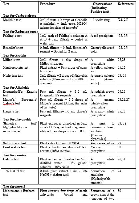 Preliminary tests with extract have been conducted to find the presence of phytoconstituents like carbohydrates, proteins, steroids, flavonoids, alkaloids, tannins, and phenolic compounds. [22]