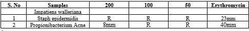 Results in Table.5 depict presence/absenceof phytoconstituents. Phytochemical studies on the whole plant extract got revealed for the very firsttime using the entire plant extract except root showed the presence of tannins, phenolics and flavonoids.Plants as such may provide alternate sources of antiacne agents with novel mechanisms and newtreatments.[34] As active principles are more soluble in alcohol, in the present studyextraction has been carried out using magnetic stirrer and hydroalcoholic employed as solvent. Results are as depicted in Table.6 wherein susceptibility alongwith the diameter ofthe zone of inhibition in comparison to the standard are mentioned. Findings confirmed antiacne potential asthe organism used in the study were sensitive to hydroalcoholic extract. Screening methods employed for natural products include disc diffusionmethods withdiffusion method variant "Disc" more suitable as it is simple and less time consuming. In the "Disc"variant natural product's diffusion by carriers like DMSO.[35] Hence, the study has beencarried out using the agar disc diffusion method. Acne is a common skin condition that affects the oil glands at the base of hair follicles. Skin illness known as acne. Acne is produced by a number of factors that occur within the pilosebaceous unit, including bacterial proliferation and inflammation. As a result, the study looked into the effectiveness of the hydroalcoholic extract against gram-positive organisms, which are known to cause acne and have ethnopharmacological properties. Impatiens walleriana extract is efficient against the anaerobic bacteria used in the study. The medicinal value of plants is derived from chemical components that have unique physiological actions. Previous research has found flavonoids, phenolics, proteins, and minerals in Impatiens walleriana flowers. Pigments are also reported in the flowers Constituents present in the whole plant of this species are not reported. In the present study extract has shown thepresence of proteins, flavonoids, tannins and phenolics. Phytochemicals like tannins exert antimicrobial activity by iron deprivation, hydrogen bounding or by non-specifically interacting with vital proteins/ enzymes, [36] Phenolics are known to cause membrane rupture and flavonoids much like tannins bind to enzymes, form complexes with the cell wall or bind to adhesions. [37] The antiacne activity of this extract may be due to the presence of either tannins/ phenolics/ flavonoids or is due to the synergistic effect of these constituents. Since bacterial growth inhibition does not mean bacterial death, the method used does not distinguish bactericidal and bacteriostatic effects.