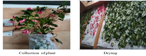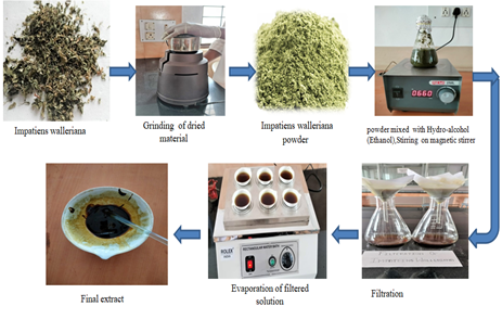 Fresh impatience walleriana leaves and stems were collected and cleaned with distilled water. The fresh leaves were dried and pulverized to a coarse powder. The coarse powder was steeped in a 50/50 ethanol/distilled water solution for three days. The mixture was then filtered via muslin cloth. The solvent in the extract was evaporated by keeping the temperature below 50 °C. The dried powder of impatience walleriana was stored in an airtight container. (Plan for standardization, extraction, and pre-phytochemical screening of herbal medications). Use 108g of powder with analytical grade hydroalcoholic as the solvent. The extraction process was then completed. [21] The dried powder of Impatiens walleriana was kept in an airtight container.