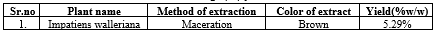 The percentage (%) yield of hydroalcoholic extract of Impatiens wallerianais given below.[21].