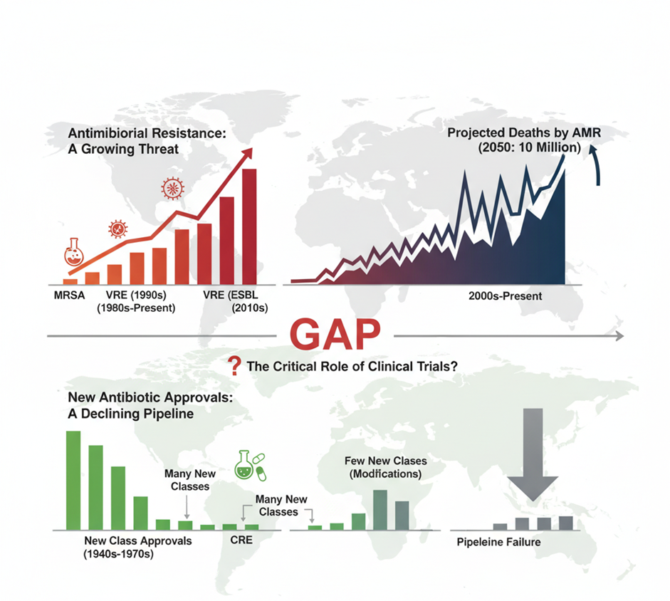 This review article is therefore dedicated to the central premise that clinical trials are essential for testing new approaches to combat the rise of AMR. The objective of this review is to provide a detailed, scientific analysis of the current landscape of AMR clinical trials. Specifically, we will: 1) delineate the major scientific and regulatory challenges hindering the efficient execution of trials for novel small-molecule antibiotics; 2) critically evaluate the emerging clinical trial data and methodological requirements for non-traditional antimicrobial approaches; and 3) assess the current economic and political landscape, proposing future perspectives, including innovative trial designs and economic 'pull' incentives, necessary to revitalize and sustain the antimicrobial pipeline. By synthesizing these elements, this article aims to provide senior researchers and policymakers with a comprehensive roadmap for accelerating the clinical validation of urgently needed AMR interventions. [1-4]