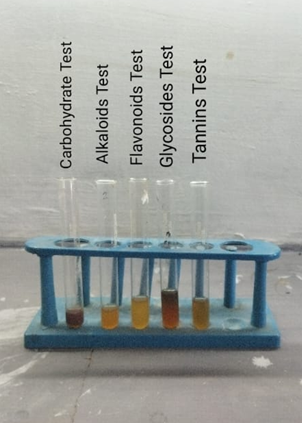 Molisch’s Test: Add 2-3 drops of Molisch’s reagent to 2 ml of plant extract and Add few drops of Conc. H2SO4 slowly along the sides of the test tube. Formation of Violet ring at the junction of two phases indicates the presence of the carbohydrates.7