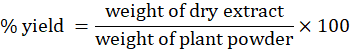 % yield =weight of dry extractweight of plant powder×100
