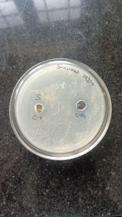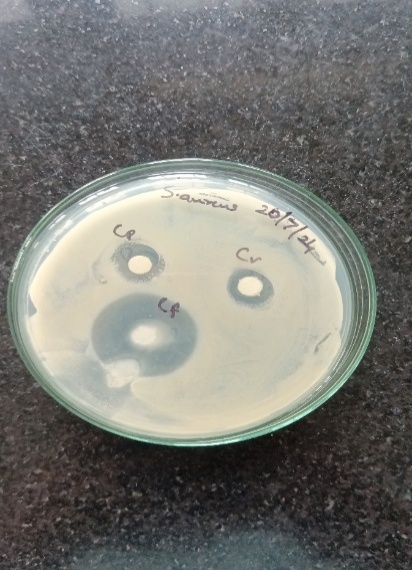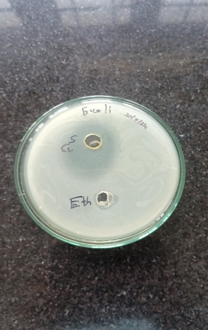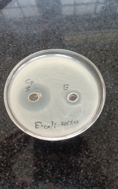 The disc diffusion method tests antibiotic effectiveness by placing antibiotic-soaked discs on agar plates inoculated with E. coli or S. aureus. As the antibiotic diffuses, a concentration gradient forms, creating a zone of inhibition. Disc soaked in Cefotaxime and test samples, along with controls (Antibiotic and Ethanol), are placed on Nutrient agar. After 24 hours of incubation at 37°C, the inhibition zones' diameters are measured and interpreted to assess Antimicrobial activity.