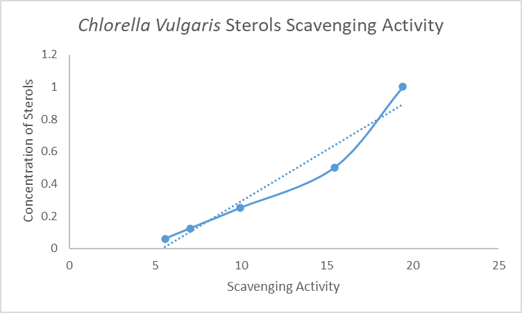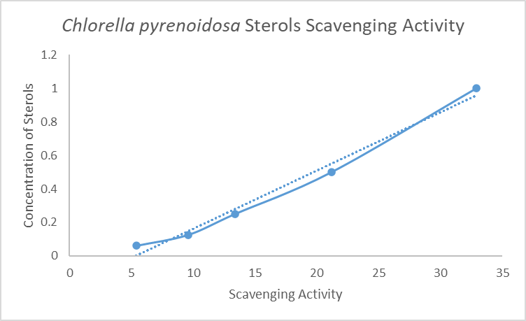 The crude sterol extracted from Chlorella’s both strains have low Scavenging activity as per DPPH biochemical assay. Each extract shows scavenging activity below 50% which restricts to calculate the IC50 value.