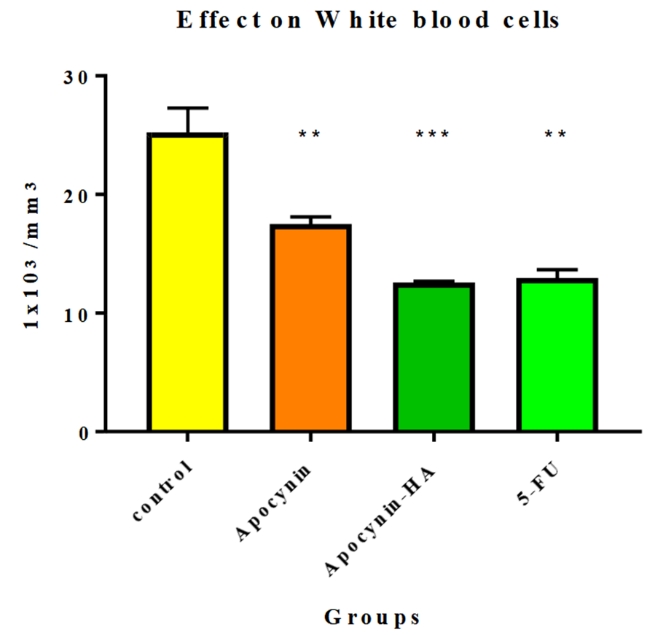 In order to know the effect of APO-HA conjugate on hematological status of EAC cells mice, a comparison between Group-I (control), Group-II (APO) Group-III (APO-HA) and Group-IV (5-FU) was done. Blood was drawn from each mice by retro-orbital plexus method. 12 µl of blood was collected in EDTA tube by puncturing retro-orbital sinus of mice for the hematological studies. The EDTA tubes containing blood samples were tested using Animal Blood Counter (Vet ABC- HORIBA) for RBC count, WBC count, packed cell volume and haemoglobin (Hb) content.[27,28]