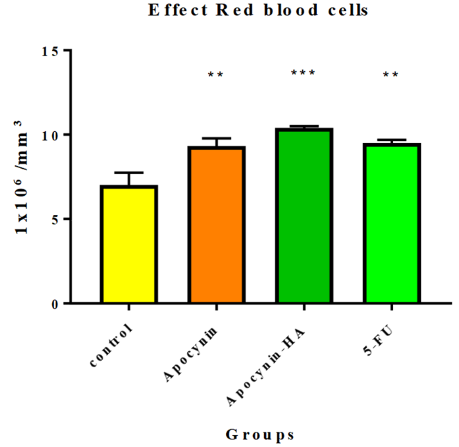 The reliable criterion for judging the value of any anticancer drug is the prolongation of lifespan of the animal and maintenance of blood parameters. Ascites fluid is the direct nutritional source for tumor cells and a rapid increase in ascites fluid with tumor growth would be a means to meet the nutritional requirement of tumor cells.34 The APO-HA conjugate decreased the ascites fluid volume and increased the percentage of life span and mean survival time. The anemia encountered in tumor bearing mice is mainly due to the reduction in RBC and Hb percentage, and this may occur either due to iron deficiency and haemolytic anemia. As RBCs die out, which they do naturally every 120 days or so, the body isn't able to replace them, and the RBC count drops. Lymphoma affects the blood and bone marrow, damages the production of RBCs and thereby causes haemolytic anaemia. A hormone called erythropoietin tells the body when to make more RBCs but cancers affect the bone marrow directly.