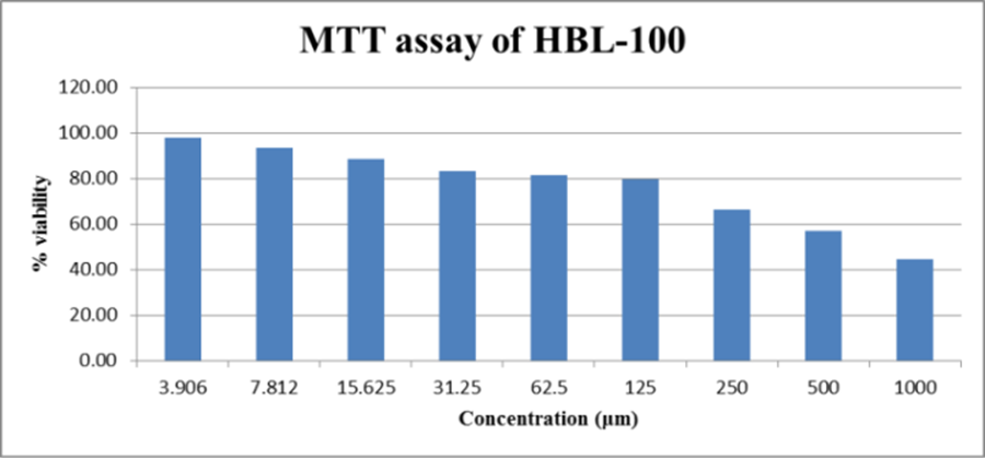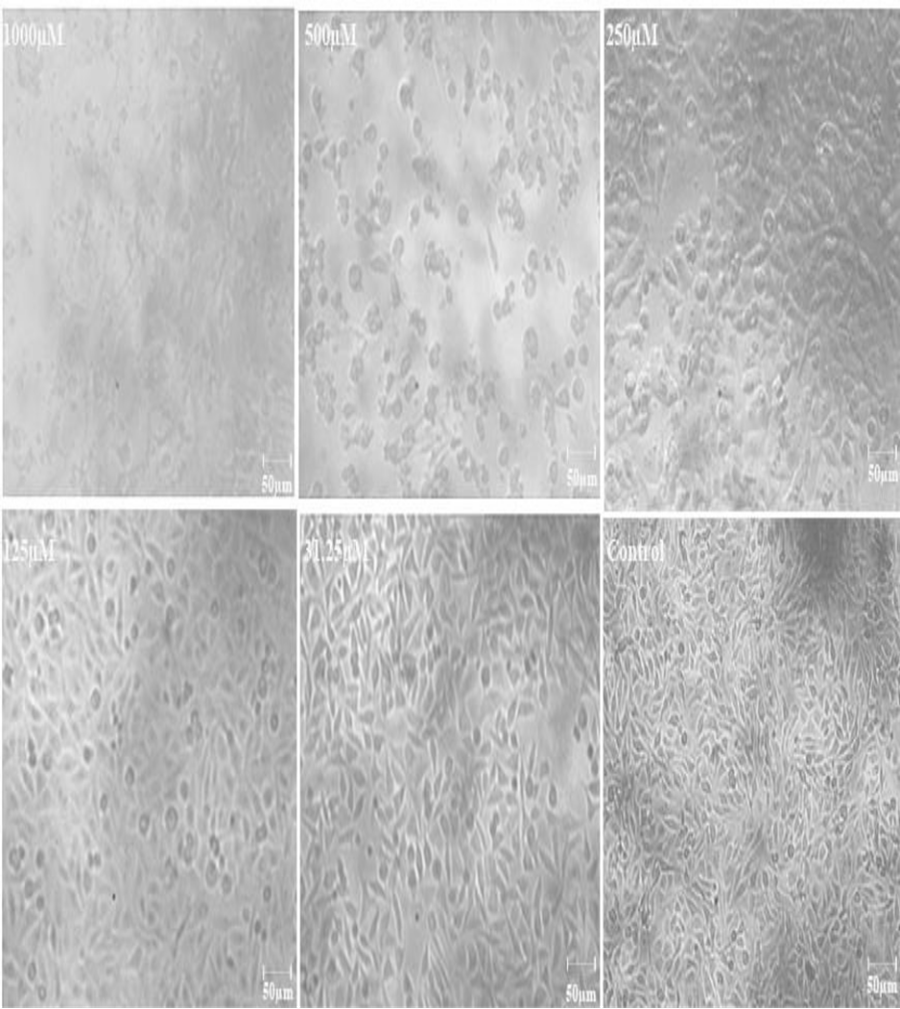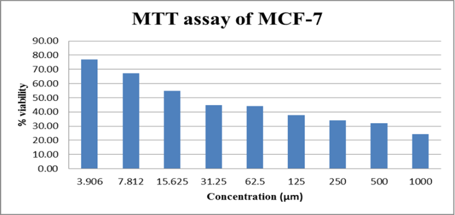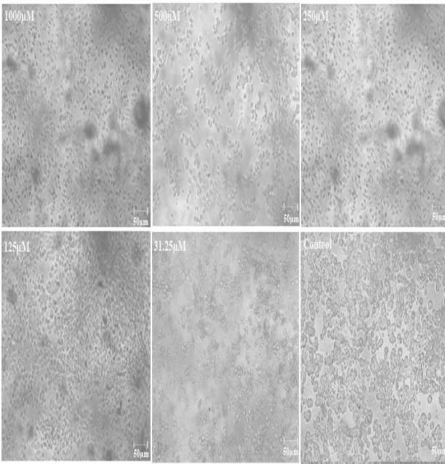The cell viability was checked by counting the number of viable cells in the above 1 ml suspension through hemocytometer and diluting the resuspended cells with growth medium to get required cell concentration. 1 × 104 exponentially growing cells were seeded per well in 96 well plates. Cells were exposed to various concentrations of drugs. The plates were incubated at 37 °C in 5 % CO2 / 95 % humidified air. After 24 h of incubation, the plates were centrifuged at 2500 rpm for 10 min and the supernatant was discarded. 100 μl of growth medium and 10 μl of MTT was added (5 mg/ml) into each well of 96 well plates and plates were incubated at 37 °C in 5 % CO2 / 95 % humidified air for 4 h. The plates were centrifuged at 2500 rpm for 10 min and the supernatant was discarded. The precipitated formazan salt was dissolved to form a colored solution by adding 100 μl of acid-isopropanol (0.04 N HCl in isopropanol) into each well. The absorbance of this colored solution was measured at a wavelength of 492 nm using a multiwell scanning spectrophotometer (ELISA reader).[20-24]