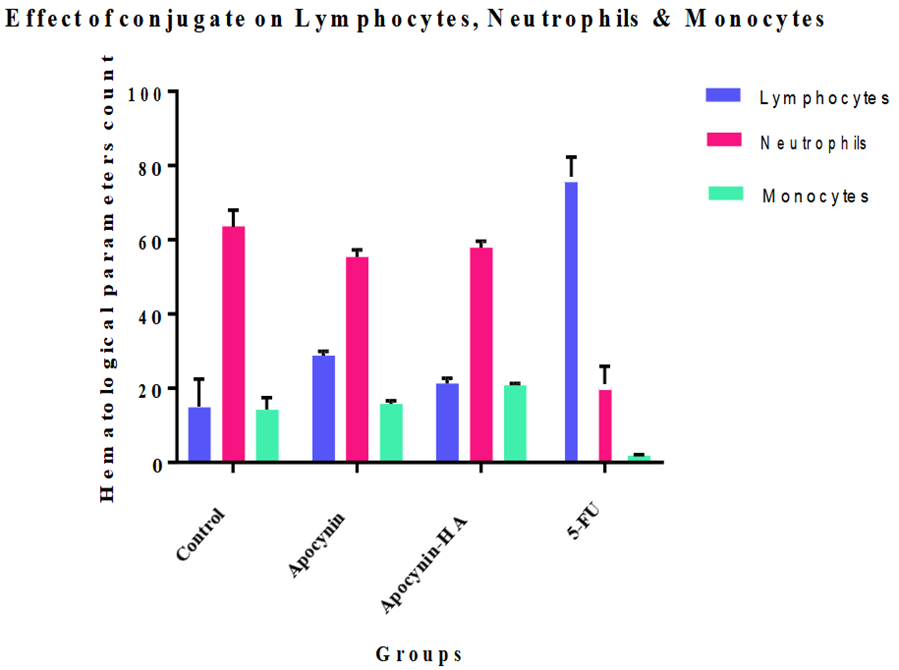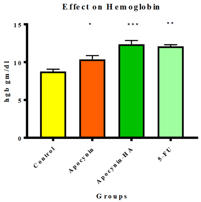 Cancers that have spread to the bone or bone marrow lowers the production of erythropoietin contributing anaemia. Packed cell volume and Hb also falls as RBC count drops.35 After repeated treatment, APO-HA conjugate reverses the changes in hematological parameters near to normal levels. This indicates that APO-HA conjugate shows protective action on the hemopoietic system. Thus APO-HA conjugate succeeded to exhibit significant anticancer activity in Ehrlich EAC bearing mice.