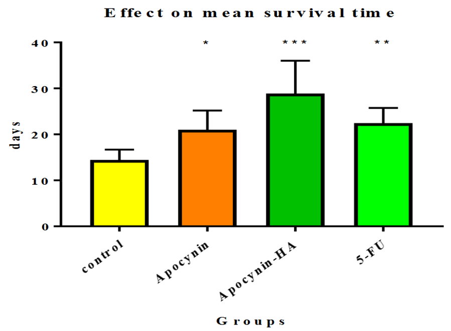 The effect of 65 mg APO and 65 mg APO-HA and 20 mg/kg 5-FU on tumor growth was monitored by recording the mortality rate daily until all the animals were dead. The mean survival time and % increase in life span (ILS) were calculated.[28]