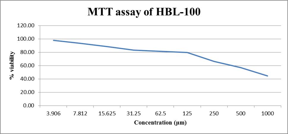 MTT [3-(4,5-Dimethylthiazol-2-yl)-2,5-diphenyl tetrazolium bromide] assay is a standard quantitative colorimetric assay for measuring mammalian cellular growth, cell survival and cell proliferation based on the ability of live cells. It can also be used to determine cytotoxicity of potential medicinal agents and other toxic materials. In this method, MTT (pale yellow) enters the cell and passes into the mitochondria of viable cell where mitochondrial dehydrogenase reduce MTT enzymatically to formazan crystals (dark blue) by cleaving the tetrazolium ring. The formazan crystals so formed are insoluble in aqueous solutions. The cells are then treated with an organic solvent, acid-isopropanol (0.04 N HCl in isopropanol), to dissolve the insoluble purple formazan product into a colored solution. The absorbance of this colored solution can be quantified by measuring at 490 to 600 nm wavelength using a multi-well scanning spectrophotometer (ELISA reader). Since reduction of MTT can only occur in metabolically active cells, the level of activity is a measure of the viability of the cells. 10 ml of the suspension cell culture was taken in 15 ml tubes and were centrifuged at 2500 rpm for 10 min. The supernatant was discarded and the cell pellet was resuspended in 1 ml growth medium.