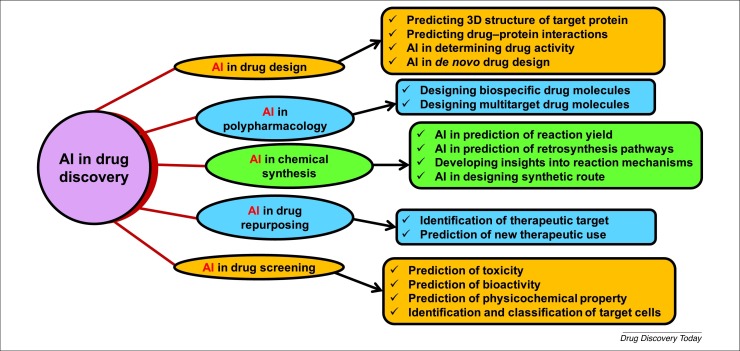 Despite its advantages, AI faces some significant data challenges, such as the scale, growth, diversity, and uncertainty of the data. The data sets available for drug development in pharmaceutical companies can involve millions of compounds, and traditional ML tools might not be able to deal with these types of data. Quantitative structure-activity relationship (QSAR)-based computational model can quickly predict large numbers of compounds or simple physicochemical parameters, such as log P or log D. However, these models are some way from the predictions of complex biological properties, such as the efficacy and adverse effects of compounds. In addition, QSAR-based models also face problems such as small training sets, experimental data error in training sets, and lack of experimental validations. To overcome these challenges, recently developed AI approaches, such as DL and relevant modeling studies, can be implemented for safety and efficacy evaluations of drug molecules based on big data modeling and analysis. In 2012, Merck supported a QSAR ML challenge to observe the advantages of DL in the drug discovery process in the pharmaceutical industry. DL models showed significant predictivity compared with traditional ML approaches for 15 absorption, distribution, metabolism, excretion, and toxicity (ADMET) data sets of drug candidates .The virtual chemical space is enormous and suggests a geographical map of molecules by illustrating the distributions of molecules and their properties. The idea behind the illustration of chemical space is to collect positional information about molecules within the space to search for bioactive compounds and, thus, virtual screening (VS) helps to select appropriate molecules for further testing. Several chemical spaces are open access, including PubChem, ChemBank, DrugBank, and ChemDB.Numerous in silico methods to virtual screen compounds from virtual chemical spaces along with structure and ligand-based approaches, provide a better profile analysis, faster elimination of nonlead compounds and selection of drug molecules, with reduced expenditure . Drug design algorithms, such as coulomb matrices and molecular fingerprint recognition, consider the physical, chemical, and toxicological profiles to select a lead compound .Various parameters, such as predictive models, the similarity of molecules, the molecule generation process, and the application of in silico approaches can be used to predict the desired chemical structure of a compound . Pereira et al. presented a new system, DeepVS, for the docking of 40 receptors and 2950 ligands, which showed exceptional performance when 95 000 decoys were tested against these receptors . Another approach applied a multiobjective automated replacement algorithm to optimize the potency profile of a cyclin-dependent kinase-2 inhibitor by assessing its shape similarity, biochemical activity, and physicochemical properties .QSAR modeling tools have been utilized for the identification of potential drug candidates and have evolved into AI-based QSAR approaches, such as linear discriminant analysis (LDA), support vector machines (SVMs), random forest (RF) and decision trees, which can be applied to speed up QSAR analysis . King et al. found a negligible statistical difference when the ability of six AI algorithms to rank anonymous compounds in terms of biological activity was compared with that of traditional approaches .