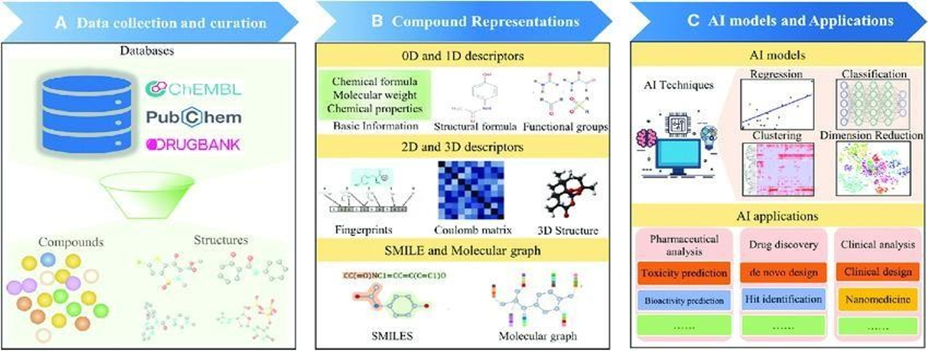 Major procedure includes (A) data collection and curation; (B) compound representations by using molecular descriptors; and (C) AI methods and their applications. ChEMBL is a manually annotated database that presently holds over 2 million compounds with drug-like properties.7ChEMBL collects data on the action mechanisms, molecular properties, absorption, distribution, metabolism, excretion, toxicity, therapeutic indications, and target interactions of the deposited compounds. ChemDB is an open-access database with about 5 million commercially available small molecules and their physicochemical properties, including molecular weight, solubility, and rotatable bonds.8 Besides these, a range of cheminformatics tools like Smi2Depict, MOL pro, AquaSol, and Reaction Predictor are incorporated into ChemDB, thus rendering the database convenient for drug discovery. The Drug-Gene Interaction Database (DGIdb) lists information on drug gene interaction and genes or gene products potentially capable of interaction with drugs.10Up until now, DGIdb encompasses over 40,000 genes and 10,000 drugs associated with greater than100,000 drug- gene interactions. Data are obtained from severalises sources using performance of expert curation and text mining. All of the genes submitted in DGIdb are assigned to 43 categories. Users may either navigate through the genes within a category or type in a list of genes or drugs to retrieve corresponding drug-gene interactions through the search module. Furthermore, DGIdb can be queried programmatically by API via the web-based interface. Drug Bank is an open-access reference drug database.11It now hosts 14,746 drugs with complete details of drug-drug interactions, drug-targets, drug classifications, and drug reactions. Users can search, browse, and extract text, images, and structural data in Drug Bank using the integrated tools. Drug Bank has emerged as the world's most popular resource for drug screening, design, and metabolism prediction. Drug Target Commons (DTC) is an open-access online resource that offers annotated and unannotated drug-target interaction (DTI) data.12For its latest release, DTC adds clinical trial information and disease-gene associations, enabling the chemical biology and drug-repurposing uses of compounds. Being anopen resource, DTC not only offers database dump but also APIto retrieve its deposited data. Discoveries of herb-focused drugs and the scientific explanation of traditional Chinese medicine. PubChem is an open-access chemical information database with the biological, physical, chemical, and toxic data of chemical molecules. All these facts are gathered from over 850 sources. PubChem allows its users to search for chemicals by entering molecular formula, structure, and other identifiers as keywords. Currently, PubChem has developed into one of the primary sources of data for computational drug discovery and design. Side Effect Resource (SIDER) is a drug-side effect database. The SIDER release under current version contains 1,430 drugs, 5,880 side effects, and 140,064 drug-side effect pairs. They can be navigated either through drugs or through side effects. The data have been applied to numerous areas, including predicting drug indications, min-ing side effects, and metabolic dysregulation identification. The Search Tool for Interacting Chemicals (STITCH) is a database that holds known and predicted chemical-protein interactions. The interactions include 9,643,763 proteins of 2,031 organisms, which were gathered from computational prediction, organism-to-organism knowledge transfer, and other data-bases. STITCH can be queried by users in various ways, including chemical and protein names, chemical structures, and protein sequences. For large- scale analysis, data in STITCH can be either bulk downloaded or accessed programmatically by API.