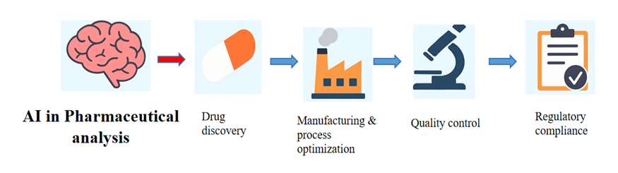 Artificial Intelligence (AI) is revolutionizing the pharmaceutical industry, particularly in the domain of pharmaceutical analysis. By integrating advanced computational algorithms with vast datasets, AI offers unprecedented capabilities in data interpretation, predictive modeling, and decision-making. Its application ranges from drug discovery and formulation development to quality control and regulatory compliance. Machine learning (ML) and deep learning models enable rapid analysis of complex chemical and biological data, leading to faster identification of potential drug candidates and optimization of analytical methods[1]. In quality assurance, AI enhances process control through real-time monitoring and detection of anomalies, thereby improving product consistency and safety. Moreover, AI facilitates the automation of traditional analytical techniques such as spectroscopy, chromatography[2], and imaging, reducing manual errors and increasing efficiency. Predictive analytics can forecast stability profiles, degradation pathways, and shelf-life with greater accuracy, aiding in better product lifecycle management. Additionally, natural language processing (NLP) tools assist in mining scientific literature and regulatory documents to extract relevant insights and ensure compliance[3]. Despite its transformative potential, challenges such as data privacy, algorithm transparency, and regulatory acceptance remain. Addressing these concerns requires collaborative efforts among scientists, technologists, and policymakers[4]. Overall, the integration of AI into pharmaceutical analysis not only accelerates research and development but also ensures higher standards of quality, safety, and efficacy in pharmaceutical products[5]. As the technology continues to evolve, AI is expected to play a pivotal role in shaping the future of pharmaceutical sciences.