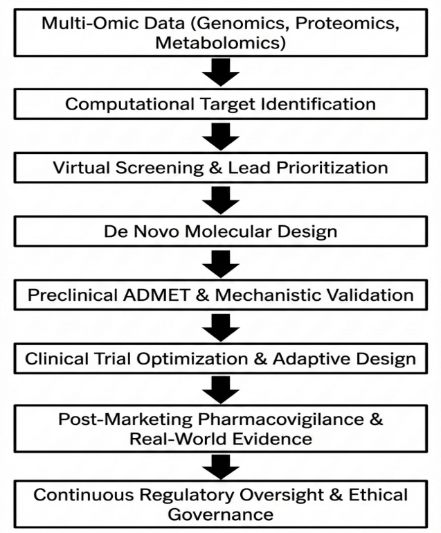 Pharmaceutical research is undergoing a paradigmatic transition driven by the convergence of computational science, large-scale biomedical data, and artificial intelligence. For much of its history, drug development has been governed by a reductionist experimental paradigm in which disease states were attributed to discrete molecular aberrations, and therapeutic interventions were designed through incremental chemical modification and empirical biological testing. While this paradigm has yielded a substantial pharmacopeia of effective medicines, it has proven increasingly misaligned with the multifactorial, network-driven etiology of contemporary diseases. Pathologies such as cancer, neurodegeneration, autoimmune disorders, and cardiometabolic syndromes are not the product of single molecular defects but rather emerge from complex, non-linear interactions among genomic variants, regulatory networks, environmental exposures, and stochastic biological processes.The escalating complexity of disease biology has been accompanied by a parallel explosion in the volume and dimensionality of biomedical data. High-throughput sequencing, multiplexed imaging, real-time physiological monitoring, and digitized clinical records have generated data streams that exceed the capacity of traditional statistical frameworks to analyze in a comprehensive or mechanistically coherent manner. Consequently, pharmaceutical research has encountered a methodological bottleneck: the capacity to generate data has vastly outpaced the capacity to extract actionable knowledge from it.Artificial intelligence offers a computational framework uniquely suited to overcoming this bottleneck. Unlike conventional bioinformatics tools that rely on predefined models and linear assumptions, AI systems learn directly from data, constructing high-dimensional representations that capture complex, non-linear relationships among biological variables. Through machine learning and deep learning, these systems identify latent structures, predictive features, and mechanistic correlations that remain inaccessible to human investigators and classical statistical techniques.The incorporation of AI into pharmaceutical research has therefore not merely accelerated existing workflows; it has altered the epistemological foundations of the discipline. Drug discovery is increasingly guided by probabilistic inference rather than hypothesis-driven experimentation alone, and therapeutic design is shifting from heuristic medicinal chemistry toward algorithmically optimized molecular engineering. In this emerging paradigm, AI functions not as an auxiliary analytical tool but as an integral component of scientific reasoning, shaping how disease is conceptualized, how drug candidates are prioritized, and how clinical outcomes are predicted.