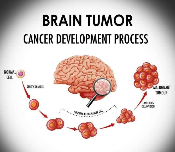 Normal brain cells acquire DNA mutations (due to heredity or external factors).These mutations affect key genes:Oncogenes get activated (promote cell growth) Tumor suppressor genes get inactivated (e.g., p53, PTEN) Result: uncontrolled cell division.