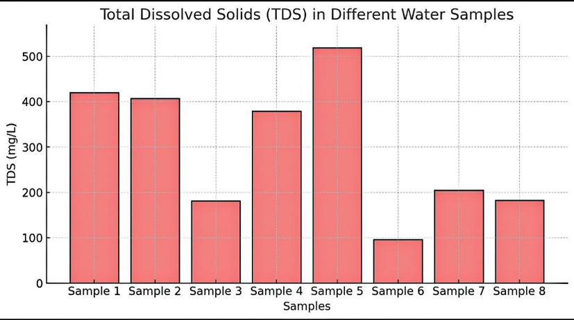 TDS concentrations varied between 96 and 519 mg/L, well within the WHO (2022) limit of 1,000 mg/L for drinking water. This indicates good overall water quality. Slightly higher TDS levels observed in groundwater sources such as borewells reflect the natural dissolution of minerals like calcium and magnesium. In contrast, surface water samples, particularly those treated by the municipal system or RO units, showed relatively low TDS, confirming effective treatment and minimal mineral loading.