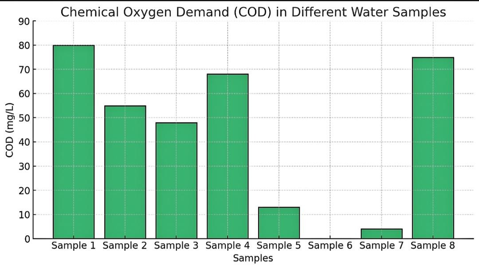 COD values varied between 0 and 80 mg/L, suggesting differences in organic pollution levels across sites. High COD values, particularly in untreated pond and borewell samples, indicate the presence of organic and inorganic matter such as sewage, detergents, and industrial effluents (Central Pollution Control Board [CPCB], 2021). In contrast, treated municipal and RO water samples had very low COD levels, showing the effectiveness of purification processes. WHO (2022) recommends COD levels below 10 mg/L for potable water. Therefore, samples exceeding this threshold are considered polluted and require treatment before consumption.