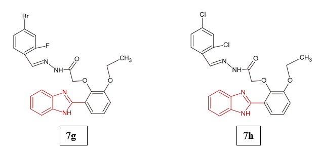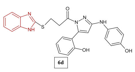 Noor et al. (2017) synthesized and characterized six novel benzimidazole–pyrazole hybrids (6a–6f) and evaluated their anti-ulcer activity using an ethanol-induced gastric ulcer model in Albino rats. All compounds showed stronger anti-ulcer effects than omeprazole, achieving 72–83% inhibition at just 500 µg/kg, compared to omeprazole’s 83% at 30 mg/kg. Among them, compound 6d was the most effective, with 83.1% inhibition and the highest binding affinity (−9.8 kcal/mol) to H?/K?-ATPase13.